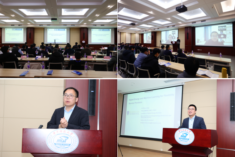 利兹大学教授李慷线上介绍了中英大学联盟及零碳工程中心的发展情况,分享了国际合作助力碳中和目标的经验。卡迪夫大学梁军教授介绍了大规模新能源并网对换流器技术,利物浦大学蒋林教授介绍了大规模电力系统的分布式仿真框架。