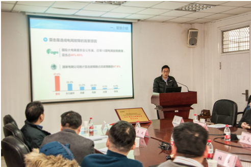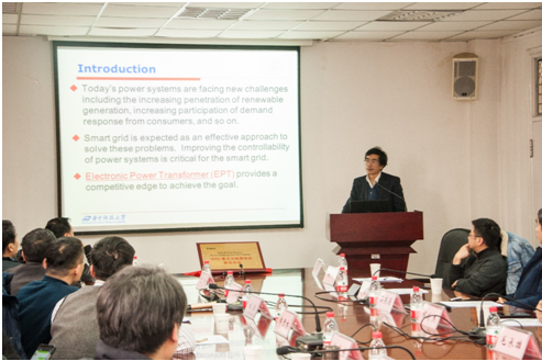 与会人员合影后,大会进入了第二阶段——武汉地区工业界与学术界交流会。共有四位代表汇报了研究成果。国网电力科学研究院武汉南瑞有限责任公司防雷输电事业部总经理谷山强结合电网雷电防护关键问题介绍了当前武汉南瑞对电网雷电防护技术的研究进展;武汉大学王波副教授分享了其研究团队在电网大数据应用中的建模思路;国网湖北省电力有限公司电力科学研究院周鲲鹏副主任介绍了湖北电网的运行特点;最后华中科技大学毛承雄教授汇报了其团队在电子电力变压器方面的研究成果。