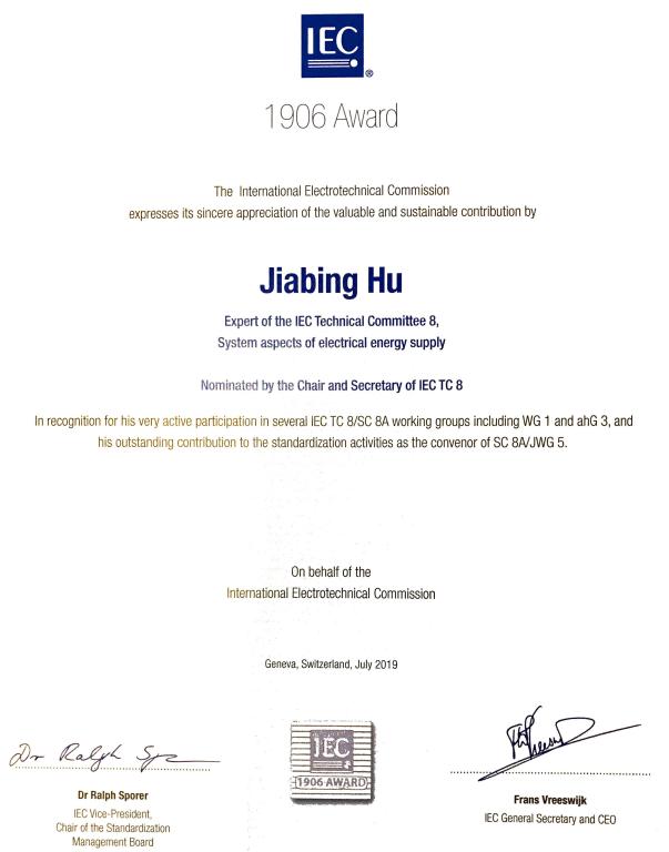 因在国际电工委员会(International Electrotechnical Commission, IEC)技术委员会SC8A(可再生能源并网)国际标准制定工作中的杰出贡献,电气与电子工程学院胡家兵教授荣获2019年度“IEC 1906奖”。