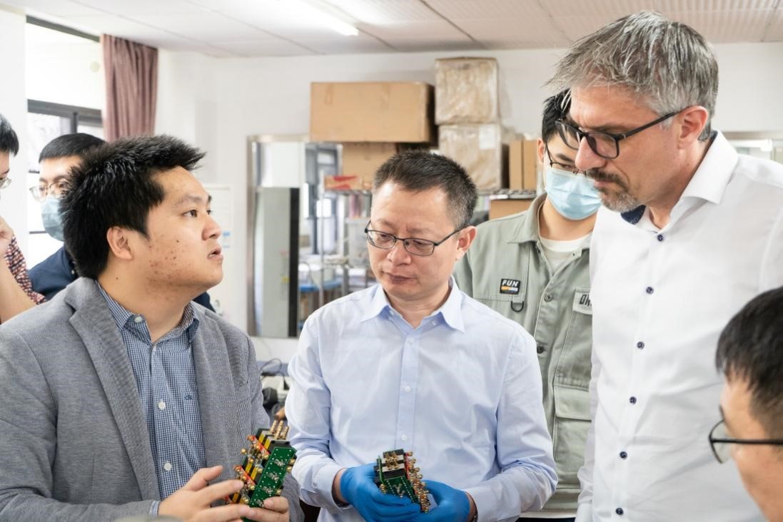 康勇教授、陈材副研究员带领博世集团参观了封装实验室,展示并讲解了双面散热模块、新型封装、高功率密度变换技术等一系列的科研成果。曲荣海教授带领博世集团参观了电机实验室,进一步介绍了团队在磁场调制电机、工业伺服电机、电动汽车驱动电机等领域的工作进展。
