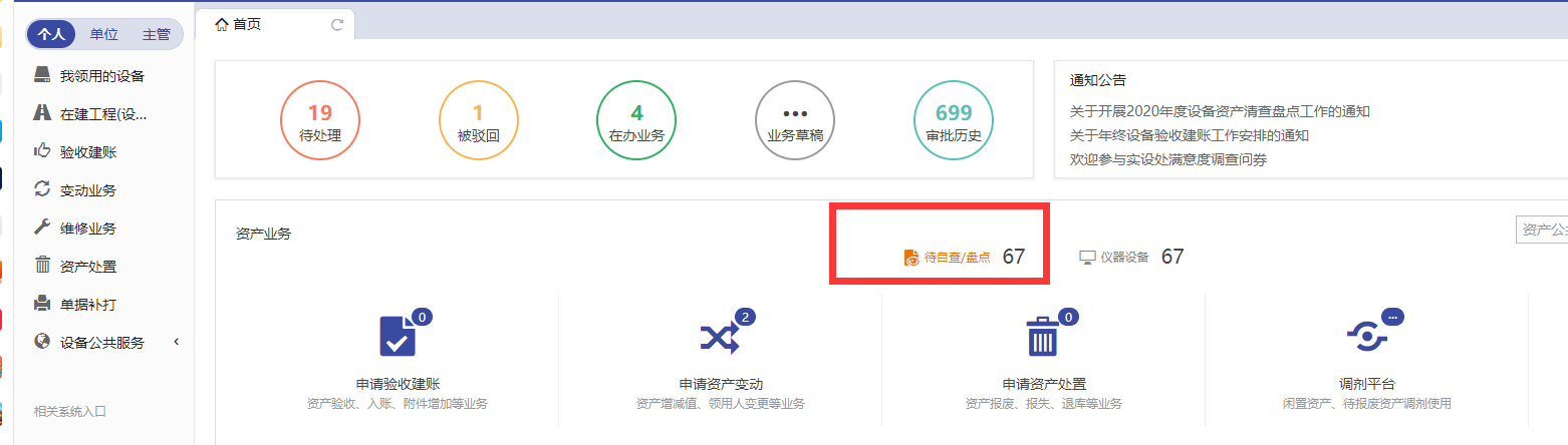 特别提醒:设备和家具管理系统,在资产管理员线上提交至主管部门资产清查审核期间,请勿进行更改领用人的操作(此时操作无效)