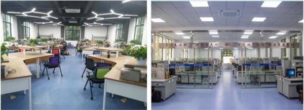 中心建设团队善于总结、利用长期指导学生创新实践中所积累的经验,并学习借鉴国内外先进的实验室建设理念和模式,改进完善实验室的环境条件。实验室布局总体实现大通透格局,办公区与教学区实现分离,学习区和研讨区配套设置,弱电实验区全开放、强电实验区在满足安全性条件下开放,为探究式、研讨式、情景式、混合式等实验教学模式的实施提供了完备、先进、高效的实验条件,也为学生自主创新、自由探究提供了智慧化、沉浸式的实践环境。