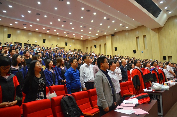典礼开始前,现场人员共同观看欣赏了我院宣传视频和毕业视频。下午二时许,典礼在庄严雄壮的国歌中拉开序幕。