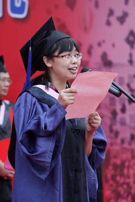 6月27日清晨,我校2010届研究生毕业典礼在主教楼前隆重举行。我院2010届经济法专业研究生啜佳佳作为优秀毕业生代表在典礼上发言。啜佳佳首先代表全校研究生毕业生向母校领导和老师们的辛勤培育表示衷心的感谢。她表示,研究生时光虽然短暂,但让人十分留恋,特别是母校六十周年校庆充分展示了“财经管理专家摇篮”的尊严与豪迈,让每一位中财学子为之自豪与骄傲。同时,研究生生活中最让人难忘的则是浓浓的师生情谊,对于恩师们辛勤培育的感谢之情溢于言表。最后,啜佳佳代表全体毕业生向母校和老师们做出郑重承诺,全体毕业生一定会秉承中财人“忠诚、团结、求实、创新”的优良传统,谨记校长的期望与嘱托,用自己的实际行动去续写中财的辉煌,回报母校、回报社会!
