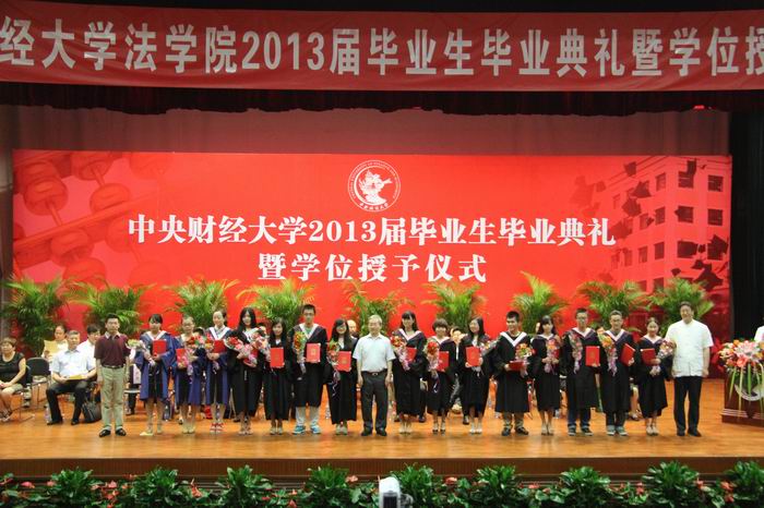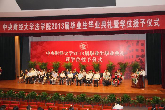 2013年6月26日下午,我院2013届毕业生毕业典礼暨学位授予仪式在学术会堂206报告厅隆重举行。学院领导班子成员、学院教师以及2013届全体毕业生参加了典礼。最高人民法院政治部副主任、我院兼职教授罗东川法官,中国人寿财产保险股份有限公司副总裁、原中国保监会法规部主任、我院兼职教授杨华柏先生,中科招商创业投资管理有限公司副总裁王希女士,岳成律师事务所创始人岳成大律师,安杰律师事务所合伙人陈斌律师,中伦文德律师事务所合伙人甄庆贵律师以及部分学生亲属出席了典礼。典礼由青年教师张小平副教授和2013届毕业研究生霍晓冉同学主持。