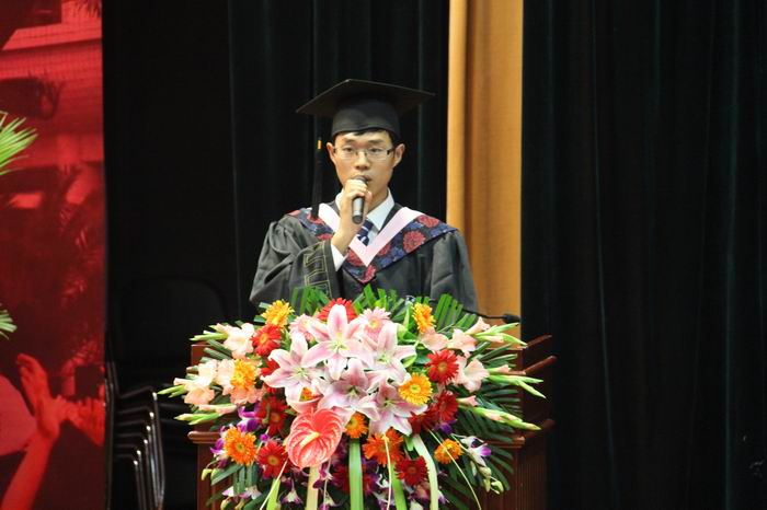 随后,2009级法学1班本科生杨冬同学、2010级法学硕士研究生陈帆同学分别作为毕业生代表发言。他们感谢母校、学院以及老师们的辛勤培养,作为中财法律人,他们表示,在未来的工作中一定会带着学院的嘱托和老师的期望,砥砺前行,发扬中财法律人的精神,勇于担当责任,为美丽中国梦的实现贡献自己的力量。临别之际,他们衷心祝愿学院的各项事业蒸蒸日上、再创辉煌!