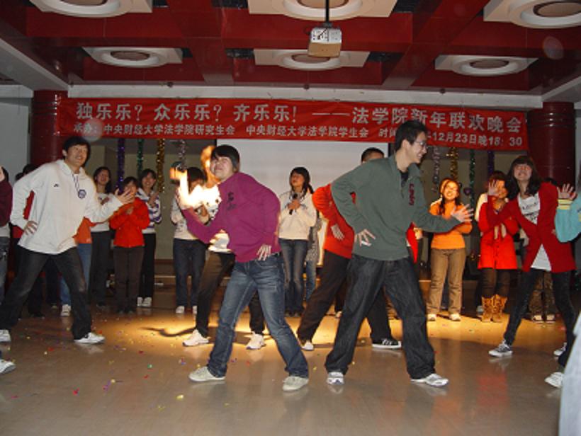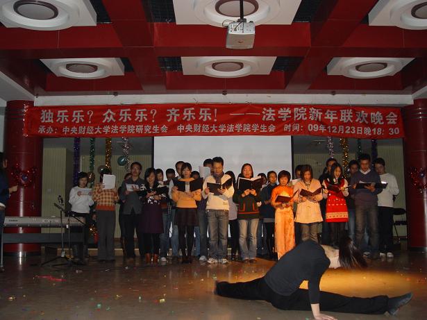 12月23日晚六点半,中央财经大学法学院举办的以“独乐乐?众乐乐?齐乐乐!”为主题的法学院新年联欢晚会在团委多功能厅举办。法学院院长郭锋教授、党总支副书记(主持工作)包英娟老师、副院长李轩副教授、副院长吴韬副教授、院长助理尹飞副教授、民法学科带头人陈华彬教授、经济法学科带头人曾筱清教授、宪法学科带头人蒋劲松教授等十余位教师,与法学院的400多名同学欢聚一堂,以欢笑总结去年取得的成绩,用自信展望明年的新目标。这次晚会不仅齐聚了学院南路校区的同学们,更是把沙河校区的大一大二两个年级的同学全部邀请过来共渡新年。