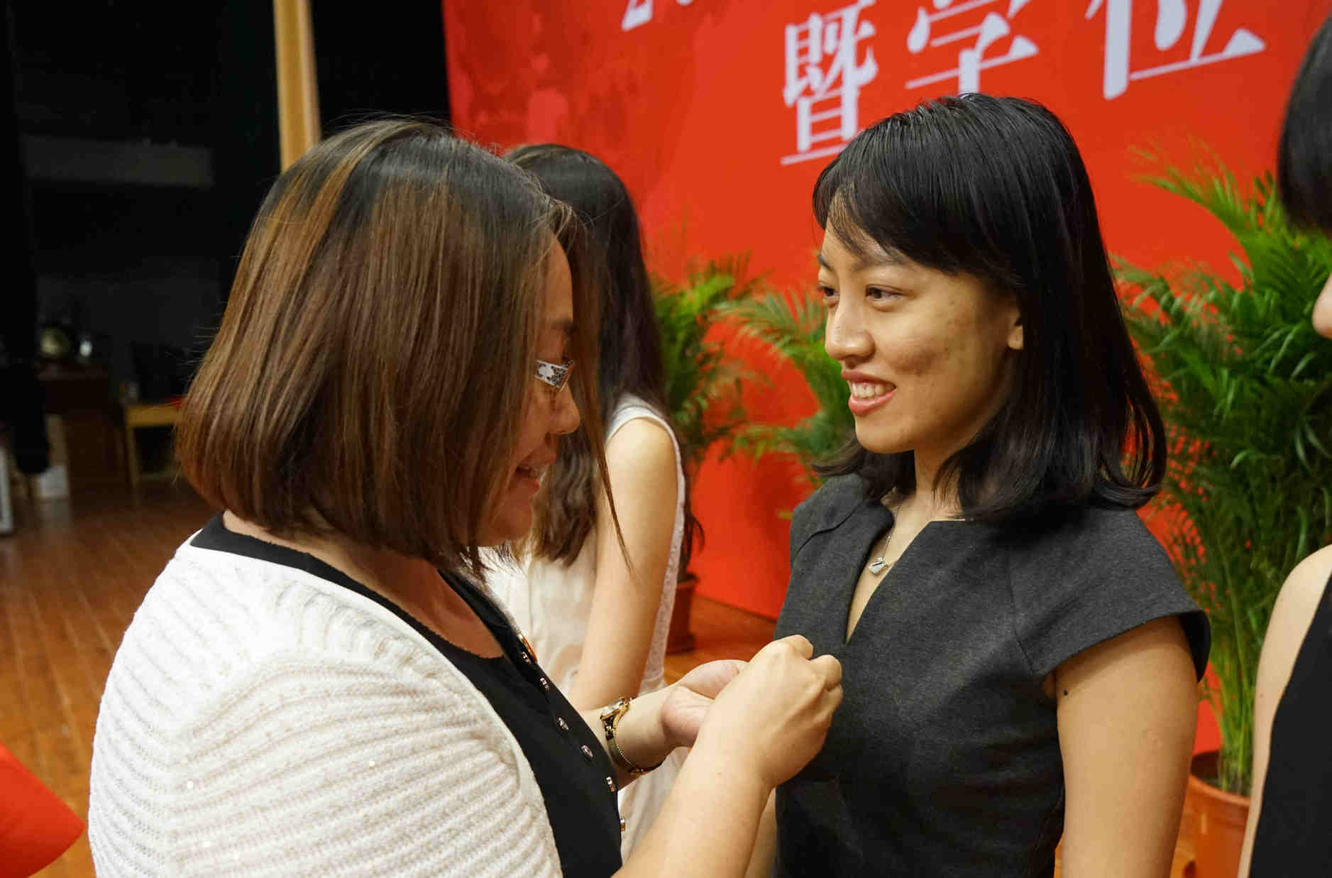在接受新校友仪式上,院党总支书记李岩、院校友工作委员会主任董新义为新校友佩戴校友徽章。