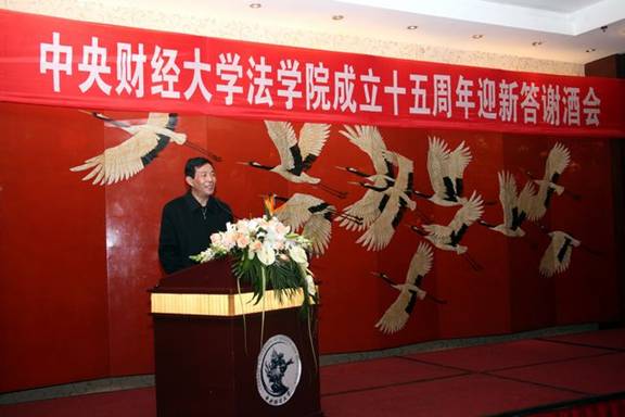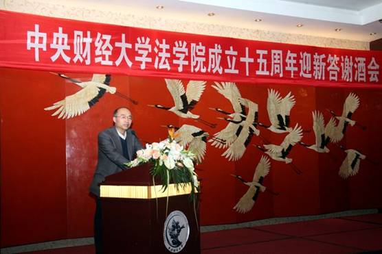 ,在辞旧迎新之际,中央财经大学法学院为了答谢成立15年来学术界、实务界和国家机关领导、专家、同仁的盛意关怀、协力襄助,在北京世纪金源大酒店隆重举行“中央财经大学法学院成立15周年迎新答谢酒会”。来自北大、清华、人大、中国政法、社科院、北师大、外经贸大等高校、研究机构的专家学者,最高法院、最高人民检察院、司法部、教育部、银监会、证监会、保监会、环保总局、北京市高级法院、北京市检察院等国家机关和中国法学会、法制日报、北京仲裁委的有关领导,建行、工行、中行、农行、中信行、中信证券、太平洋证券、中国移动的高管,北京五家大型律师事务所的合伙人,以及中央财大的校领导、法学院师生共150多人应邀出席或参加了酒会。