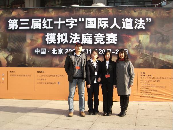 2009年11月21日至22日,中国高校第三届红十字“国际人道法”模拟法庭竞赛在中国人民大学成功举行。在朱家贤副教授的指导下,由我院2007级法学2班韦莹同学(The First Counsel)、2008级法学研钟璐同学(The Second Counsel)以及2008级法学研王志力同学(The Coach)组成的中央财经大学代表队首次代表我校参加了竞赛,经过两天的激烈角逐,最终取得第四名的成绩,这也是目前我院在类似比赛中取得的最好成绩。