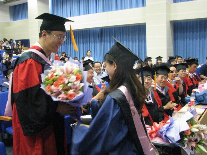 伴随着主持人富有深情的朗诵,毕业生代表向教授们献上鲜花,以此表达自身的感激之情,难忘师恩,永生难忘!