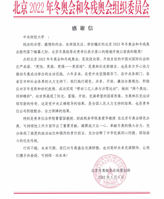 近日,北京冬奥组委总体策划部向我校发来感谢信,对我校法学院曹富国教授、财政税务学院姜爱华教授在北京冬奥会绿色办奥、可持续性办奥方面所做的工作表示感谢。