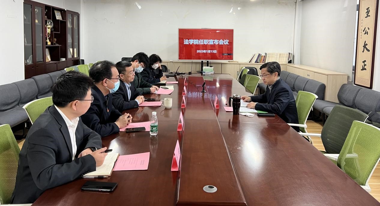 2023年1月13日下午,法学院召开全院教职工大会,校党委副书记梁勇同志到会宣布新一届学院领导班子任职决定。原任领导班子成员和新任领导班子成员线下参会,全体教职工线上参加了会议。