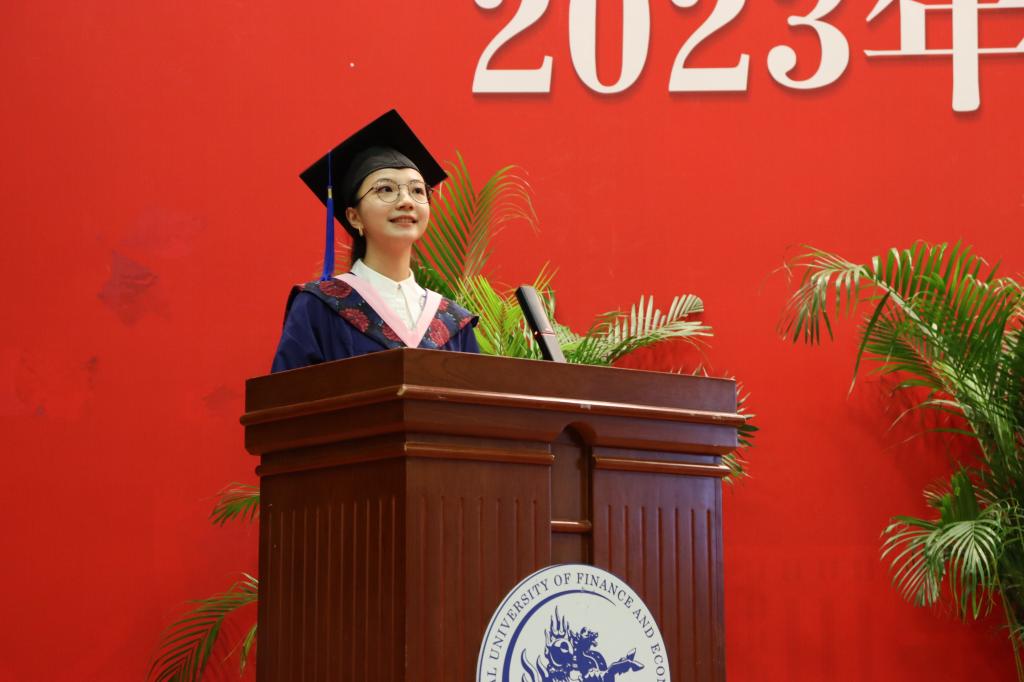 星河浩瀚风正劲,胸怀梦想赴长空。在这强国富民、复兴中华的新时代,我们即将背上行囊,从中财启程,时刻秉承中财大“忠诚、团结、求实、创新”的校训,踏上新的人生征程,以青春奔赴明天,用热血丈量远方。在此,祝愿青春洋溢的我们以坚毅之心、笃实之行练就担当作为的本领,祝愿独一无二的我们以青春之我、奋斗之我续写砥砺奋进的篇章!祝愿我们亲爱的中财法学院不断续写新的辉煌!谢谢大家!