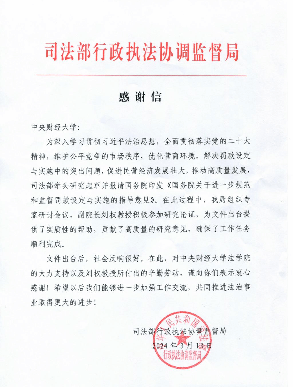 行政执法是行政机关履行政府职能、管理经济社会事务的重要方式,罚款是较为常见的行政执法行为。行政执法工作面广量大,一头连着政府,一头连着群众,直接关系群众对党和政府的信任、对法治的信心。司法部在信中表示,司法部牵头研究起草并报请国务院印发《国务院关于进一步规范和监督罚款设定与实施的指导意见》,在此过程中,中央财经大学法学院副院长刘权教授积极参加研究论证,为文件出台提供了实质性的帮助,贡献了高质量的研究意见,确保了工作任务顺利完成。