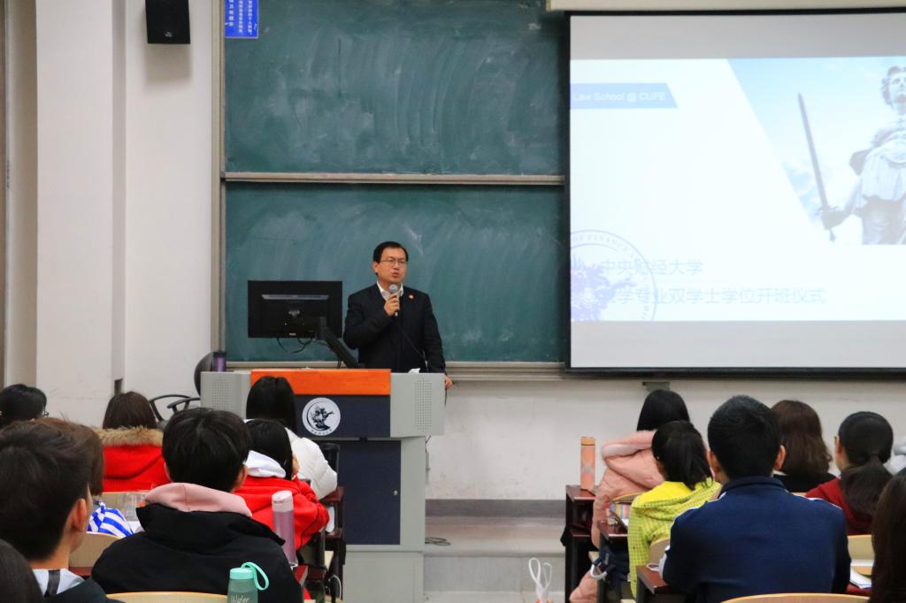3月17日上午,中央财经大学2018年法学双学位开班仪式在沙河校区东区主教214隆重举行。院长尹飞教授,副院长李伟副教授,院长助理赵真副教授,授课教师代表于洪伟副教授、武腾博士,教务范颖老师出席仪式。本期修读双学位的130名同学参加仪式。开班仪式由赵真副教授主持。