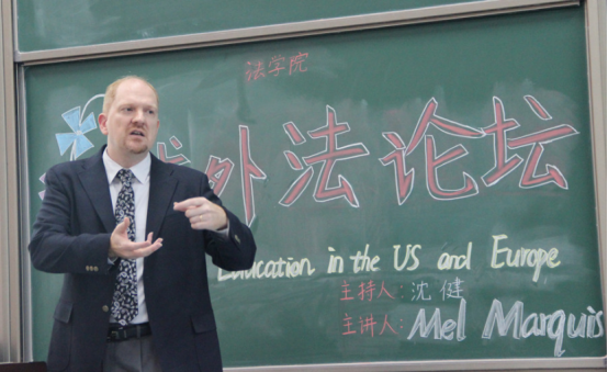 讲座开始,沈健博士首先介绍了主讲人——Mel Marquis教授。Marquis教授非常熟悉欧美法律教育与学习,他先后在美国、意大利获得了法学硕士与博士学位。