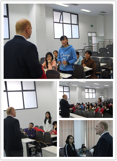 在提问环节,很多同学就感兴趣的法学学习和中西方法学教育差异提出了问题。有同学提出:“听说在西方大学中,很多同学都会在图书馆通宵看书,这是真的么?”对此,Marquis教授作了认真详细的回答:“不同的教授有不同的做法。对于我而言,我不会给学生们布置非常多的阅读任务。反而,我会希望减少阅读时间,更好地理解材料。”但是,他也强调,“The more you read in pro-active way, the better!”