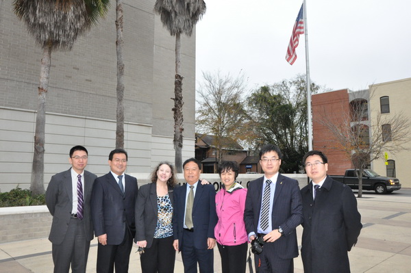 考察团28日飞抵佛罗里达州盖恩斯维尔市,访问了佛罗里达大学Fredric G. Levin 法学院。法学院院长Robert Jerry教授会见并宴请了代表团。分管学术事务的高级副院长Alyson Flournoy教授、Stuart R. Cohn教授、比较法项目主任Pedro A. Malavet教授、郑文通助理教授参与了会见。双方就各自学院发展情况以及两院的合作交流前景进行了探讨。尹飞教授、刘燕副教授就房地产法、知识产权法的相关问题与佛大相关教授进行了交流。Stuart R. Cohn教授带领代表团参观了法学院图书馆和诊所教育中心,代表团同参与诊所教育的教师、学生进行了交流。佛大法学院诊所教育专职教师Jennifer Mary Zedalis带领代表团参观了阿拉楚阿县刑事法院并旁听了刑事案件的庭审。