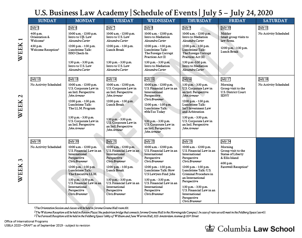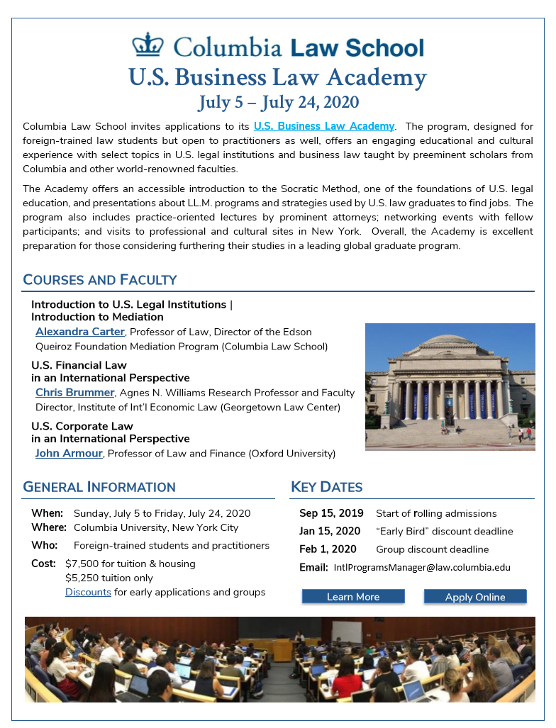 美国哥伦比亚大学法学院是一所位于纽约市曼哈顿的世界一流法学院。哥大法学院将于2020年7月5日至7月24日举行为期三周的美国商法暑期课程(U.S.Business Law Academy)。该暑期课程专为接受过非美国法训练的学生设计,也向从业人员开放。课程提供苏格拉底式教学,以及有关LLM项目和美国法学毕业生就业策略的介绍。课程还包括由知名律师举办的以实践为导向的讲座、与其他课程参与者的互动活动,以及参观纽约的职业和文化场所。在2020年1月15日前提交申请的,可以获得提前申请折扣;在2020年2月1日前六名或以上集体申请的,可获得团体折扣。