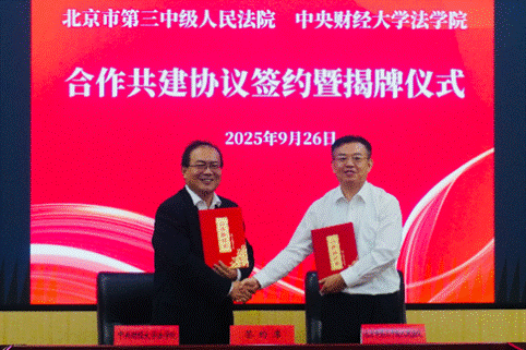 2025年9月26日,中央财经大学法学院与北京市第三中级人民法院举行法治人才协同培养基地合作共建协议签约暨揭牌仪式。北京市第三中级人民法院党组书记、院长薛春江,党组成员、政治部主任马骏,政治部副主任、干部处处长马斌,综合处处长张珂,研究室副主任王世洋,综合处三级调研员郭莹、办公室干部宋成;中央财经大学副校长栗峥,法学院院长尹飞、院党委书记于文豪、党委副书记徐颖、副院长刘权、副院长殷秋实、党委组织员陈诚,以及学院事务主管赵真、周游、刘泊宁,学院合作与发展办公室李紫仪等参加活动。
