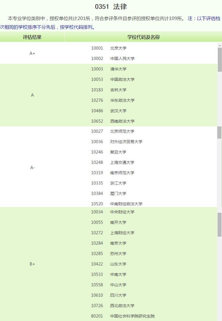 法律硕士专业学位授权单位全国共计201所。本次符合参评条件且参评的授权单位共109所,以2011年至2015年的数据为基础。评估结果显示,北京大学、中国人民大学位居A+等级,清华大学、中国政法大学等6所高校位居A等级,上海交通大学、浙江大学等8所高校位居A-等级。中央财经大学与南京大学、山东大学、中山大学、四川大学等10所高校并列B+等级。