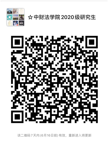 根据学院要求,为便于2020级研究生后续工作的顺利开展,特建立“中财法学院2020级研究生群”,请大家及时扫描下方二维码实名制入群!