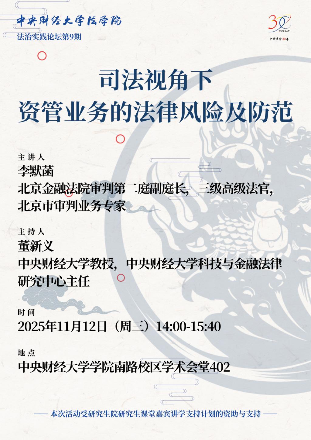 讲座|11.12|李默菡:司法视角下资管业务的法律风险及防范