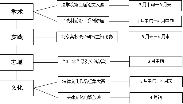 计划于314日举办“法律文化月”开幕式活动,届时将邀请学院相关领导出席并讲话,邀请首都各高校法学院研究生会代表参加。