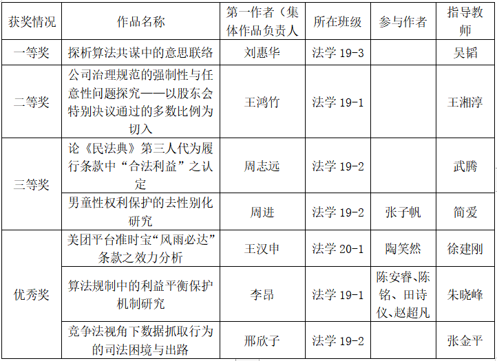 中央财经大学第二十一届“挑战杯”学生课外学术论文竞赛法学院获奖情况