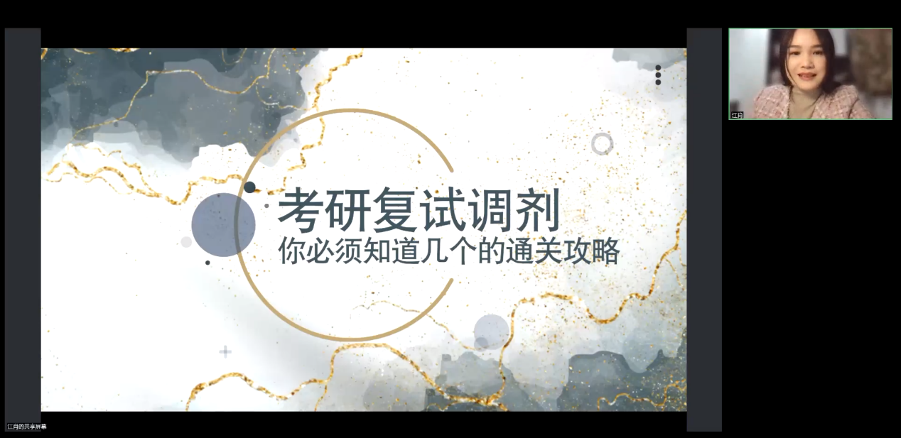 讲座第二部分由江肖老师为完成考研初试的同学们提供考研复试备考的指导及调剂情况介绍。针对考研复试,江老师认为考研复试的准备时间紧而任务重,因此建议同学们应当尽早着手准备复试考核。而对于复试的内容和形式,江老师介绍到复试一般包括了体检、笔试和面试三个流程,笔试主要为专业课内容,而面试又包括了专业课面试和英语面试。往年受疫情影响,复试考核多为线上考核,而基于现在的形势,今年不排除进行线下考核的可能性,因此同学们应当充分考虑,周全准备。江老师也对复试考生提出了三点备考建议:一是随时关注官网,联系报考院校上岸前辈分享经验;二是笔试面试同时准备,注意法言法语和英语口语的联系;三是重视全真模拟面试,反复练习,积累经验。针对调剂情况,江老师向同学们介绍了调剂的种类,并指导同学们可以从研招网、各招生单位的研究生招生官网等网络渠道获取各校调剂信息。同时,同学们应当按各校要求准备好申请调剂的所需材料,有需要的同学应当及时申请。最后,江老师向同学们简要介绍了华北、华东、华南等地区历年来接受调剂的院校分布情况。