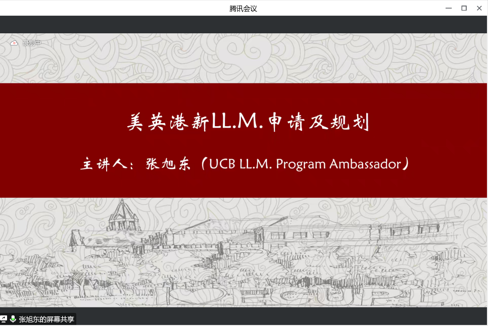 本次讲座分为两个部分。第一部分由张旭东律师针对“美英港新LL.M.申请及规划”进行专题讲座。首先张律师建议同学们在留学申请前,应当从个人职业规划、个人自身条件及个人成长目标三方面综合考虑自身是否适合LL.M.项目。对于有志就职于红圈律所、外资企业等或从事非诉业务、争议解决业务、知识产权、国际贸易业务等同学,考虑申读LL.M.项目是较为不错的选择。具有优秀专业成绩和语言成绩的同学或者希望提升法律文书阅读及写作技能、获得海外法律实务经验的同学也都可以考虑申请LL.M.项目。其次,张律师简要介绍了申请LL.M.的申请流程。LL.M.的申请主要分为学信网或学校认证、成绩评定或填写申请单、Rolling basis、Offer&Waiting List、接受offer等五个流程。张律师提醒同学们完成申请流程大致需要2个月的时间,因此需要尽早准备材料,合理安排申请时间。然后张律师向同学们简要介绍了包括U.S.T14、U.S.T20在内的名校LL.M.项目,并建议同学们结合自身职业规划选择合适的学校和项目。最后张律师向同学们介绍了其母校美国加州大学伯克利分校(UCB)的LL.M.项目的授课与考核方式,并欢迎同学们申请报读。