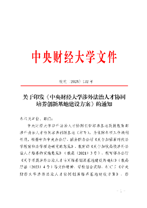 中央财经大学2024年获批教育部、中央依法治国办涉外法治人才协同培养创新基地。2025年,学校及法学院持续加强基地建设,涉外法治人才培养工作取得一系列新成绩。