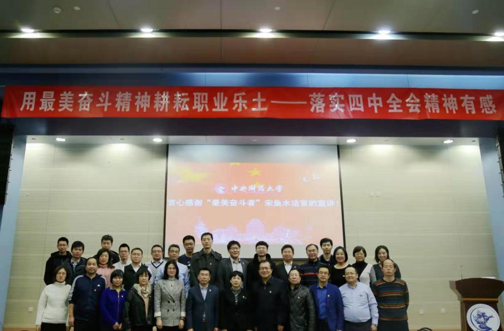 2019年12月9日晚,“最美奋斗者”、北京市学习贯彻党的十九届四中全会精神宣讲团成员宋鱼水同志莅临中央财经大学,在学术会堂402报告厅为师生带来“落实四中全会精神,做最美奋斗者”的主题宣讲。法学院教师党员三十余人和学生党员、学生干部三百余人参加活动。