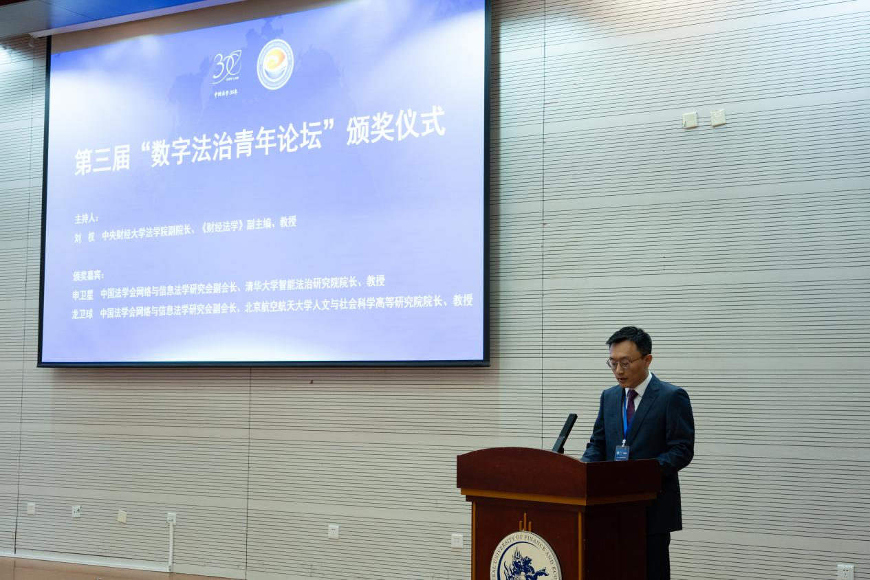 开幕式后,论坛举行优秀论文颁奖仪式。中央财经大学法学院副院长刘权教授主持仪式,中国法学会网络与信息法学研究会副会长、清华大学智能法治研究院院长申卫星教授,中国法学会网络与信息法学会副会长、北京航空航天大学人文与社会科学高等研究院院长龙卫球教授,中国法学会网络与信息法学研究会副会长、中国政法大学王立梅教授及《财经法学》主编、中央财经大学法学院邢会强教授为获奖代表颁奖。