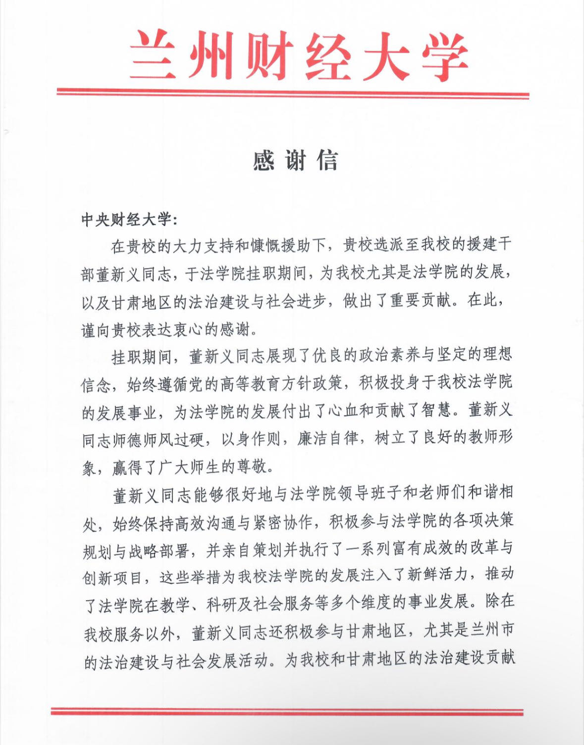 日前,兰州财经大学就董新义老师援建事宜向我校致以感谢信。在感谢信中,兰州财经大学对董新义老师在兰财大援建工作情况给予了高度评价,称赞其师德师风过硬、工作勤勉、廉洁自律,为兰财大法学院的发展和甘肃地区法治建设作出了重要贡献,赢得了兰财大学校、法学院及其他服务单位的高度认可。董新义老师的积极工作树立了中央财经大学教师的良好形象。