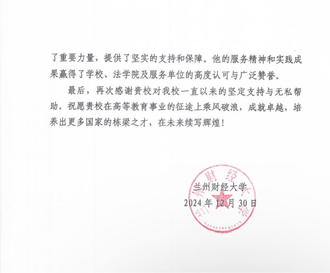 董新义老师于2023年9月赴兰州财经大学法学院开展援建工作,并克服困难延长半年服务期于2024年12月底返回学院工作,选派其援建兰州财经大学法学院是我院落实学校与兰州财经大学《对口支援协议》的具体举措。今后,我院将继续坚持服务推进东中西部高校协作、推动西部高等教育高质量发展和服务构建新发展格局的国家战略,坚决贯彻落实教育部和学校关于对口支援西部地区高等学校的工作部署,多方面、多层次、持续性地支持兰州财经大学等西部兄弟院系的发展,为我国东西部高等法学教育的同步发展继续作出贡献。