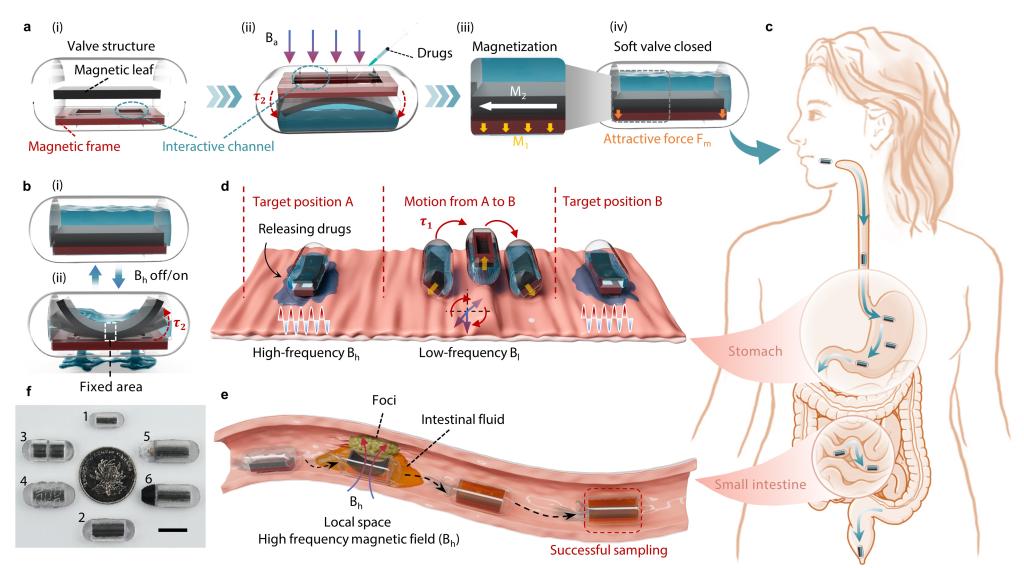 胃肠道疾病严重危害人民生命健康,发展高效早诊早治技术对于保护胃肠道健康具有重要意义。然而,目前有线式电子内窥镜和无线式胶囊内窥镜均存在明显局限性,亟待创新突破:前者具有诊疗一体化功能,但常伴有强烈不适感且存在禁忌症等问题;后者无痛、无创,但以图像诊断为主,无采样和给药等治疗功能。近年来发展起来的磁控胶囊机器人技术,因磁驱动方式具有非接触、高可控性和穿透性能好等优势而被认为是最理想的胃肠道疾病诊疗手段之一,但现有磁控胶囊机器人主要采用内置永磁体的设计模式,普遍存在体积大(尺寸大于#00号胶囊,8.53×23.3mm)、载药量低以及医疗功能单一等问题。