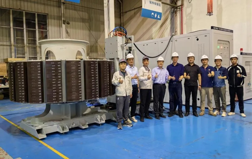 (中心在全球首创的大型电机“无磁装配—整体充退磁技术”在20兆瓦级永磁风力发电机上实验成功。)
