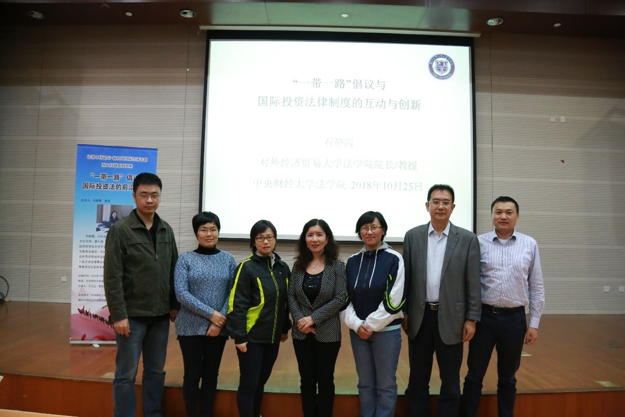 2018年10月25日下午,中央财经大学“法治中国论坛”之“新时代国际经济法制重大问题系列讲座”在学术会堂202室举行。本次讲座邀请国务院学位办法学学科评议组成员石静霞教授主讲“一带一路”倡议下国际投资法的前沿问题。石静霞教授现任对外经济贸易大学法学院院长、教授、博士生导师,兼任教育部法学教育指导委员会成员、中国国际经济法学会副会长、中国法学会世界贸易组织法研究会副会长兼秘书长、罗马国际统一私法协会理事会成员等职,系最高人民法院国际商事专家委员会首批专家委员,第七届“全国十大杰出青年法学家”。参加本次讲座的有我院国际法教研室吴晓丹副教授、肖芳副教授、沈健博士、时业伟博士以及2017级法律硕士研究生、2016级本科生共两百余人。讲座由法学院副院长王克玉教授主持。