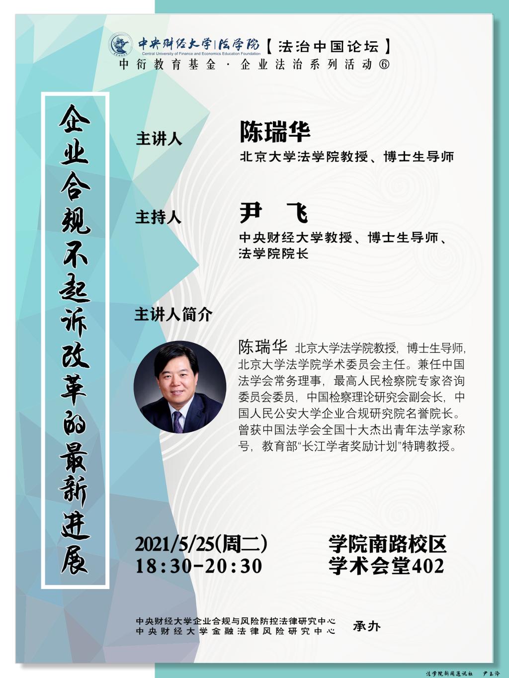主讲人简介:陈瑞华,北京大学法学院教授,博士生导师,北京大学法学院学术委员会主任。兼任中国法学会常务理事,最高人民检察院专家咨询委员会委员,中国检察理论研究会副会长,中国人民公安大学企业合规研究院名誉院长。曾获中国法学会全国十大杰出青年法学家称号。