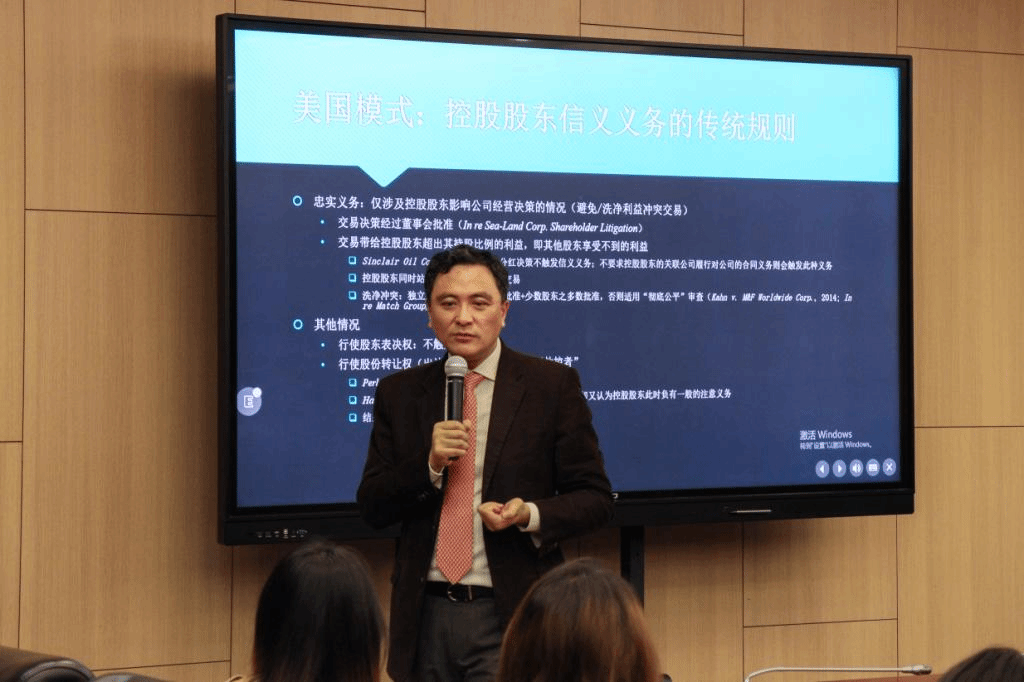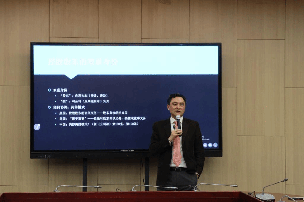 邢会强教授对张巍教授在法学领域的成就进行介绍,对其到来表示热烈欢迎。张巍教授就控股股东的双重身份进行讨论,指出控股股东不仅以自身利益为本,还需对公司及其他股东负责。在此基础上导致的利益冲突有两种协调模式,美国模式强调由股东直接承担义务,而英国模式更注重对影子董事的规制。就新《公司法》第180条及192条来看我国更类似于英国模式。