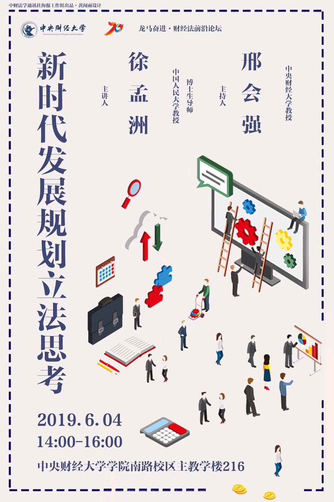 2019年6月4日下午,中国人民大学教授、博士生导师徐孟洲做客中央财经大学“财经法前沿论坛”,在学院南路主教216教室作了主题为“新时代发展规划立法思考”的学术讲座。