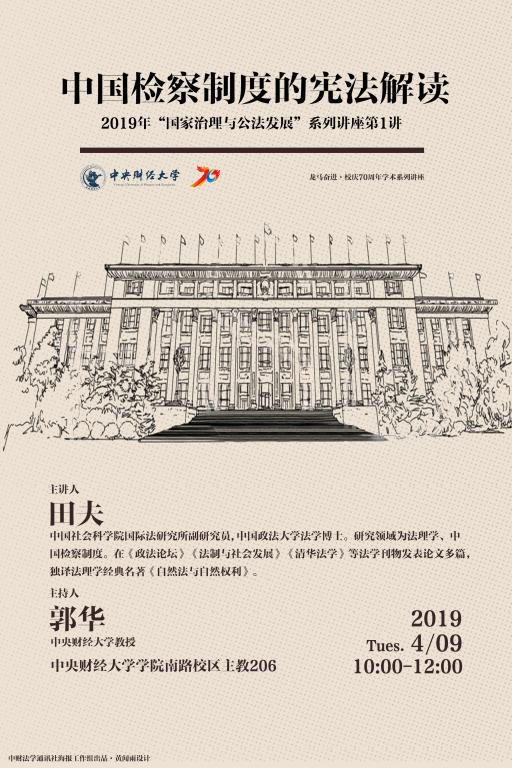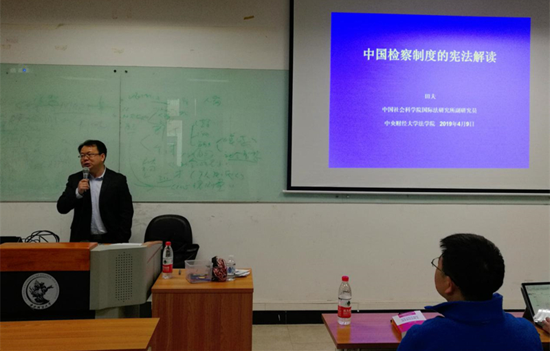 2019年4月9日上午,中国社会科学院国际法所副研究员田夫做客中央财经大学法学院“财经法前沿论坛”,主讲“中国检察制度的宪法解读”。郭华教授担任本次讲学的主持人,副院长李伟副教授、院长助理赵真副教授、法理学教研室主任郑玉双副教授、白冰博士与谈。本次活动是2019年“国家治理与公法发展”系列讲座第1讲。