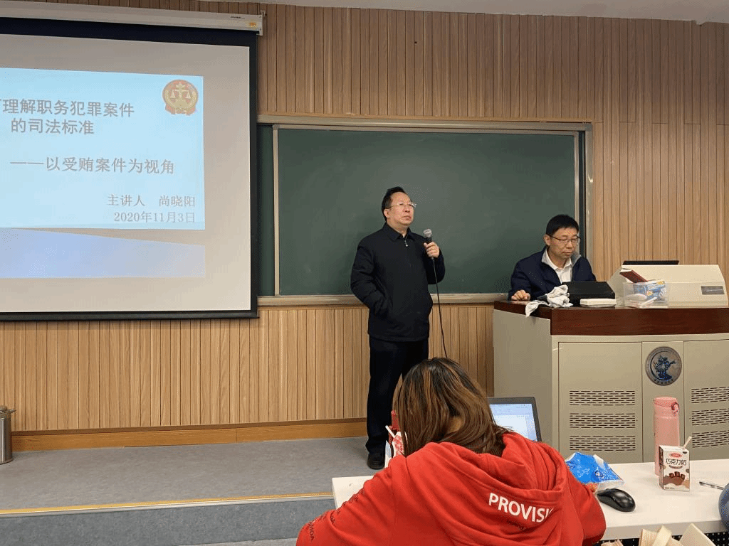 2020年11月3日晚,最高人民法院刑二庭尚晓阳法官莅临我院法律实务论坛,在主教103教室为我院研究生带来题为“如何理解和把握职务犯罪案件的司法标准—以受贿案件为视角”的讲座,本次讲座由李邦友教授主持,副院长李伟副教授、教学事务主管张琪副教授、刑法教研室于洪伟副教授、李朝晖副教授和简爱老师出席讲座。