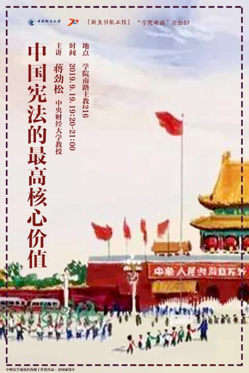 2019年9月19日晚,“学院难路论坛”第57期在学院南路校区主教216教室举行。本次论坛同时也是法学院“新生引航工程”的讲座活动。蒋劲松教授以“中国宪法的最高核心价值”为题主讲,白斌副教授主持。中国政法大学法学院陈征教授应邀出席。参加的还有我院于文豪副教授、刘权副教授、赵真副教授、郑玉双副教授以及部分硕士研究生和本科生。