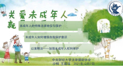 第二个主题是《未成年人保护》,宣讲同学为沙桐、王璐瑶。两位同学分别从未成年人的特殊法律地位与保护,未成年人如何增强自我保护意识等方面进行讲述,并通过一个个小案例来讲解未成年人保护法的具体保护措施。