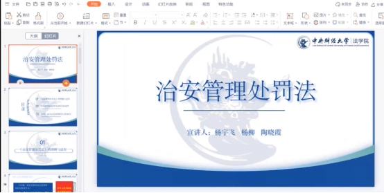 第四个主题是《社会治安管理法》,宣讲同学为杨宇飞、陶晓霞、杨柳。三位同学主要讲解了社会治安条例是什么、治安管理处罚法的处罚方式和如何适用,并通过违反治安管理处罚法的热点案例生动形象向听众展示治安管理处罚法的具体适用。