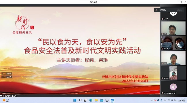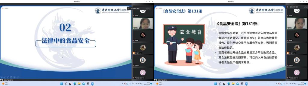 为更好地开展“科普食品安全知识及食品安全法”主题普法宣传活动,让《食品安全法》走进每一个群众的日常生活当中,更好地让人民群众运用法律武器维护自己的食品安全,10月23日下午14:00,由中央财经大学法律援助协会负责人周雨欣带队,成员柴琳、程纯主讲,携手成员陶笑然、吴天奇,共同参与了由北京市西城区天桥社区青年汇主办,晨夕法律服务中心协办的直播普法活动,为20名天桥小区的青年带来了“食以安为先——食品安全普法宣讲”主题普法宣讲活动。
