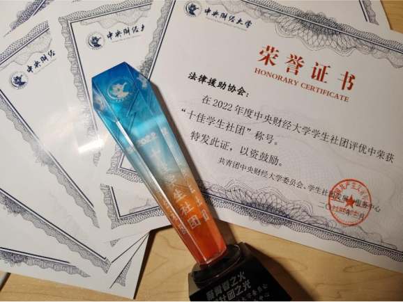 2023年3月15日,中央财经大学法律援助协会在2022年度学生社团评优大会中荣获“十佳学生社团”称号,协会的 “普法进万家”项目获评2022年“优秀学生社团活动项目”,协会指导教师李伟老师获评“十佳社团指导老师”奖项,同时协会还斩获了“十佳学生社团负责人”(周雨欣 22级法硕法学)和“社团之星”(陶晓霞 法学19级本科生)等奖项,实现了五年以来社团评优奖项的“大满贯”!